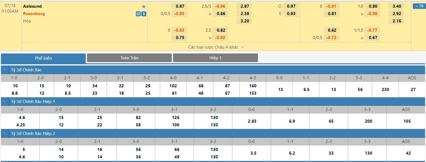 Xem tỷ lệ kèo cá cược bóng đá trực tuyến Aalesund vs Rosenborg