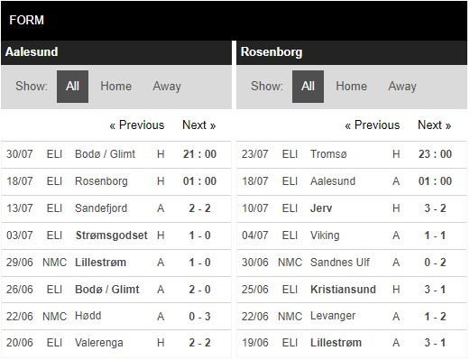 Thống kê phong độ Aalesund vs Rosenborg
