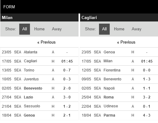 AC Milan hiểu rằng họ phải giành được ít nhất 4 điểm trong 2 vòng đấu cuối để có mặt trong top 4 và trở lại sân chơi Champions League mùa sau. Đối thủ kế tiếp của Milan sẽ là một Cagliaria không quá mạnh và đang đứng ở vị trí thứ 15 trên bảng xếp hạng. Một chiến thắng sẽ mang lại lợi thế tâm lý cực lớn cho Rossoneri trước trận đấu hạ màn mùa giải. Ngoài ra, nếu Milan thắng Cagliari mà Napoli hoặc Juventus sảy chân thì top 4 cũng chính thức thuộc về họ chứ không cần chờ đến vòng cuối.