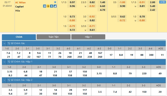 Xem tỉ lệ kèo cá cược bóng đá trực tuyến AC Milan vs Cagliari