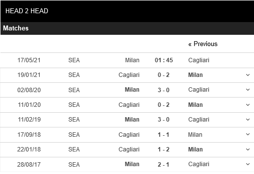 Cũng phải kể đến thành tích đối đầu vượt trội của Milan trước Cagliari. Đội bóng áo đỏ đen đã thắng 7 trong 10 trận sân nhà gần nhất gặp Cagliari với cách biệt 2 bàn trở lên. Họ cũng đã thắng 10 trận gần nhất tiếp đón Cagliari tại San Siro. Đó là những điểm tựa chắc chắn để Milan nghĩ về một chiến thắng và xây chắc vị trí của mình trong top 4 Serie A mùa này.