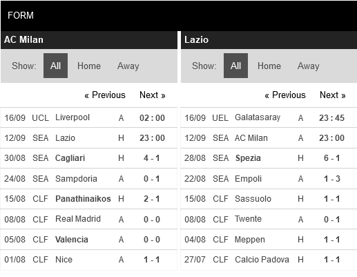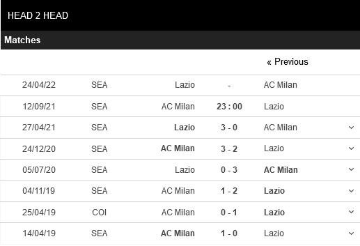 Thành tích đối đầu giữa 2 bên có một sự cân bằng rất lớn. 10 trận gần nhất thì mỗi đội có 3 chiến thắng và 4 trận hòa nhau. Dù có lợi thế sân nhà thì Milan có lẽ cũng khó khuất phục được Lazio trong trận đối đầu sắp tới.