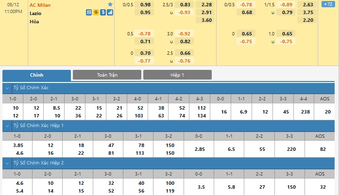 Xem tỉ lệ kèo cá cược bóng đá trực tuyến AC Milan vs Lazio