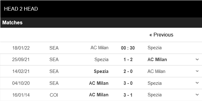 Thống kê đối đầu AC Milan vs Spezia
