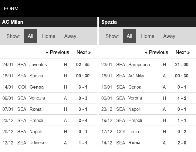 AC Milan đang có chuỗi trận ấn tượng ở Serie A. Rossoneri có chuỗi 3 trận thắng liên tiếp trước trận gặp Spezia. Nếu giành chiến thắng, AC Milan có cơ hội trở lại ngôi đầu khi Inter đụng phải Atalanta ở vòng đấu này.