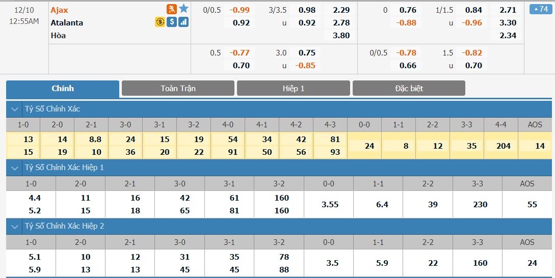 Xem tỷ lệ kèo cá cược bóng đá trực tuyến Ajax vs Atalanta