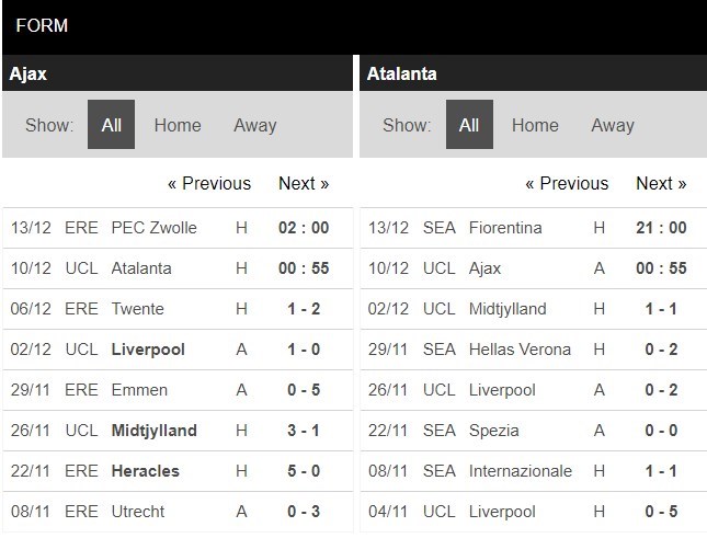 Trước khi bước vào lượt trận cuối quyết định tại Champions League, Atalanta đã có thời gian trống để nghỉ ngơi do không phải tham dự loạt trận tại Serie A hồi cuối tuần qua. Tại Serie A, họ đang có 1 mùa giải khó khăn hơn dự kiến khi mà không thắng 3 vòng gần nhất. Hiện tại, Atalanta đang tạm đứng hạng 9 trên BXH cùng 14 điểm nhưng còn trong tay 1 trận chưa đấu. Việc nghỉ ngơi 1 tuần sẽ giúp đội bóng này có trạng thái tốt nhất ở trận đấu tới. Trong trận lượt đi, Ajax và Atalanta đã tạo nên một trận cầu sôi động với 4 bàn thắng được ghi chia đều cho mỗi bên.
