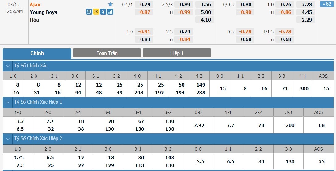 Chu kỳ lên xuống tỷ lệ kèo Ajax vs Young Boys