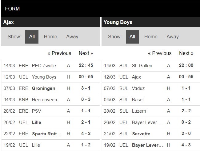 Young Boys đang có phong độ không ấn tượng. Ở liên tiếp 3 trận đấu gần nhất của mình, Young Boys đều bị những đối thủ dưới cơ cầm hòa và họ cũng thua kèo châu Á ở cả 3 trận đấu nói trên. Hàng công của đôi bên đang chơi vô cùng tốt thời gian qua. 5 trận đấu gần nhất trên mọi đấu trường, Ajax ghi tới 13 bàn thắng còn với Young Boys là 8. Đại diện Super League toàn hoà 3 vòng vừa qua và đều thủng lưới ít nhất 1 bàn mỗi trận.