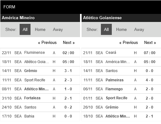 Họ không thắng trong 4 trận đấu gần nhất trên mọi đấu trường, thua tới 3 trận. Tuy nhiên, Goianiense có lợi thế là chỉ phải gặp những đối thủ ở nhóm dưới bảng xếp hạng trong những vòng đấu cuối cùng. Điều mà họ cần bây giờ là một kết quả tích cực trước America MG để tạo ra một cú nước rút hoàn hảo.
