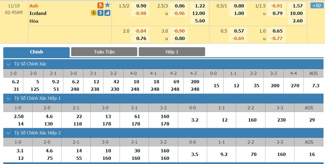 Tỷ lệ kèo cá cược bóng đá trực tuyến trận Anh vs Iceland