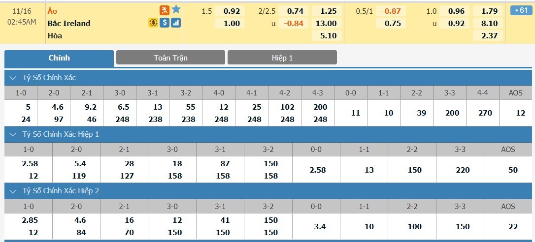 Tỷ lệ kèo cá cược bóng đá trực tuyến trận Áo vs Bắc Ireland