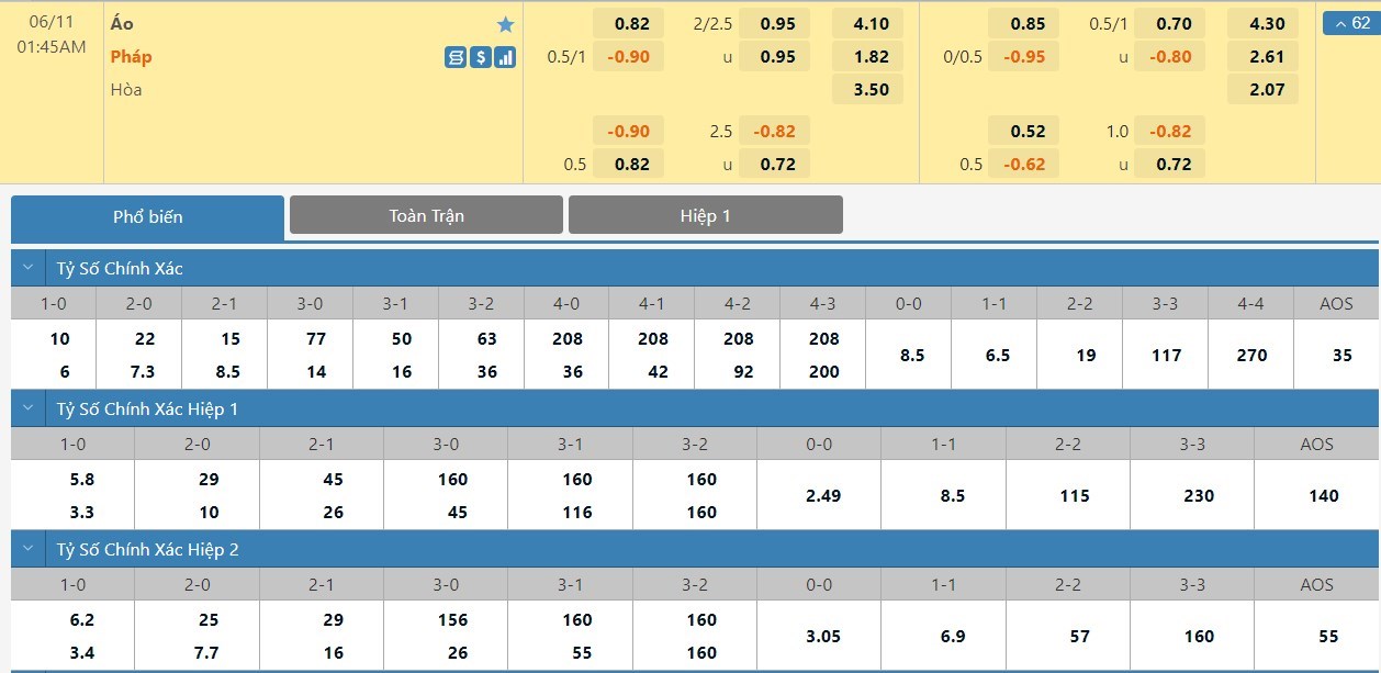 Xem tỷ lệ kèo cá cược bóng đá trực tuyến Áo vs Pháp
