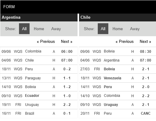 Thống kê phong độ Argentina vs Chile