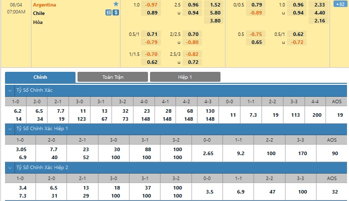 Xem tỉ lệ kèo cá cược bóng đá trực tuyến Argentina vs Chile