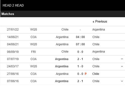 Thống kê đối đầu Argentina vs Chile