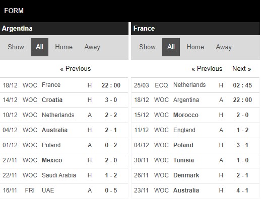 Thống kê phong độ Argentina vs Pháp