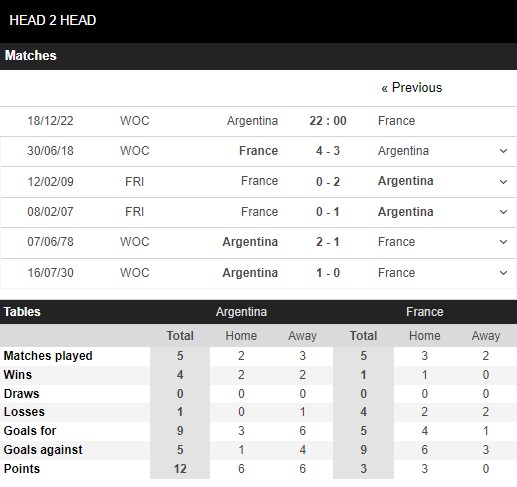 Thống kê đối đầu Argentina vs Pháp