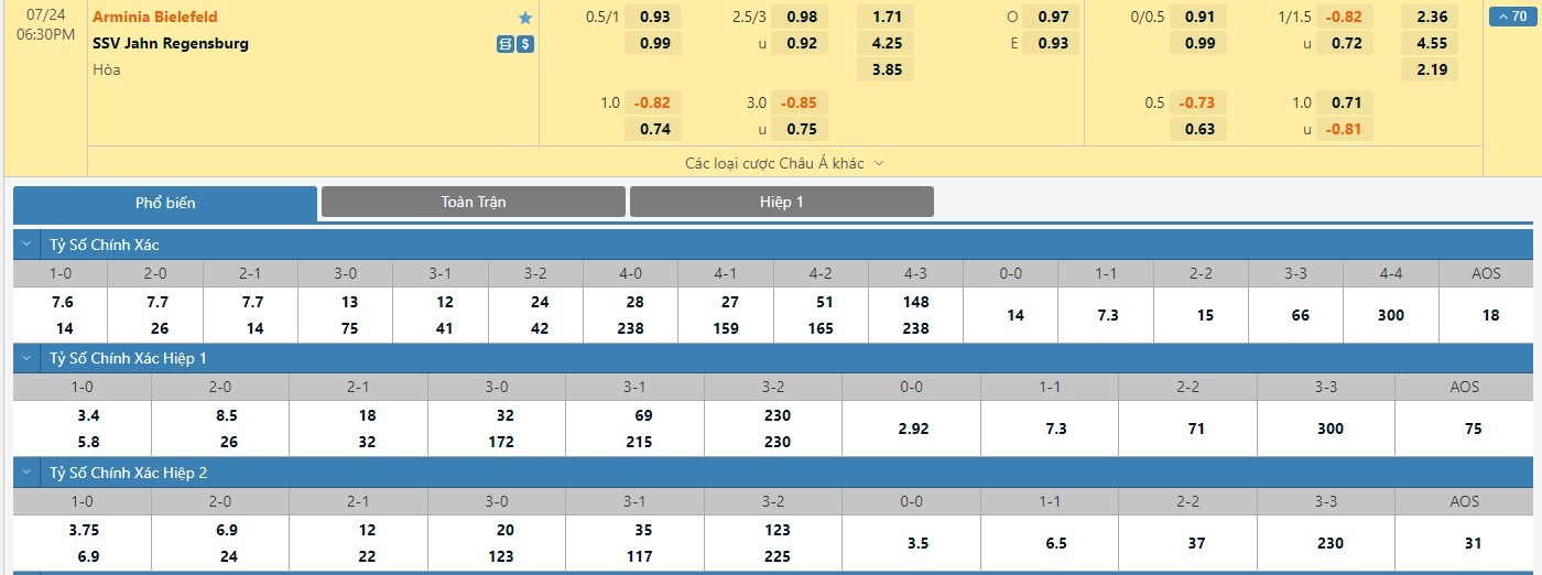 Tỷ lệ kèo cá cược bóng đá trực tuyến trận Arminia Bielefeld vs Jahn Regensburg