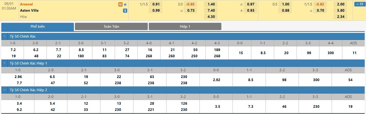Tỷ lệ kèo cá cược bóng đá trực tuyến trận Arsenal vs Aston Villa