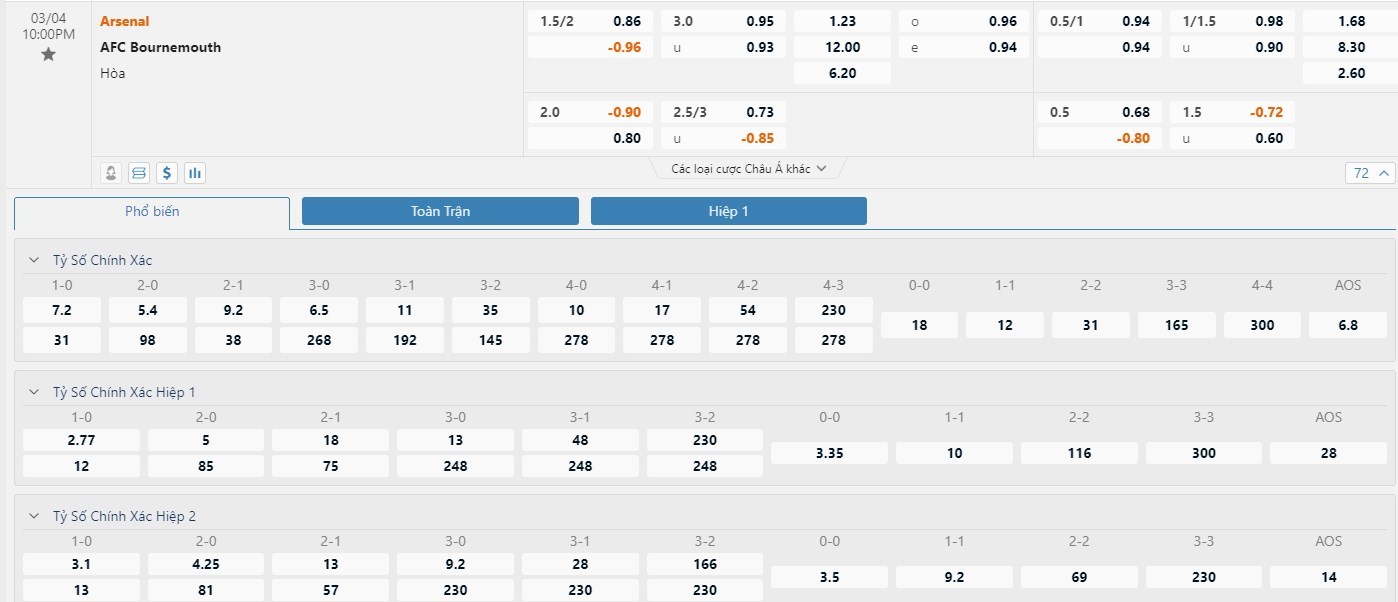 Tỷ lệ kèo cá cược bóng đá trực tuyến trận Arsenal vs Bournemouth