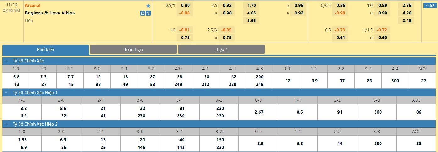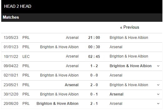 Trong 5 trận đấu gần nhất đôi bên đụng độ nhau trực tiếp, Arsenal đã không có trận đấu nào mang về được cho mình ít nhất là 1 bàn thắng trong hiệp đấu đầu tiên. Còn với Brighton, đội bóng này cũng chỉ có 1 lần làm được điều này trong 45 phút đầu tiên. Với tỷ lệ kèo hiệp 1 ở trận đấu này được đưa ra là -1/4 trái thì người chơi nên tin tưởng vào đội khách trận này.