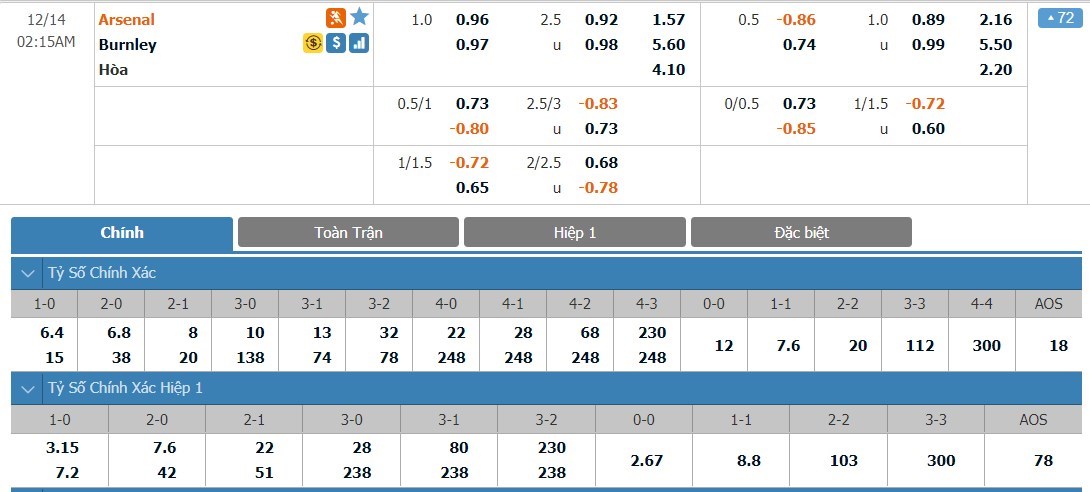 Xem tỷ lệ kèo cá cược bóng đá trực tuyến Arsenal vs Burnley