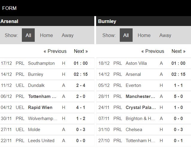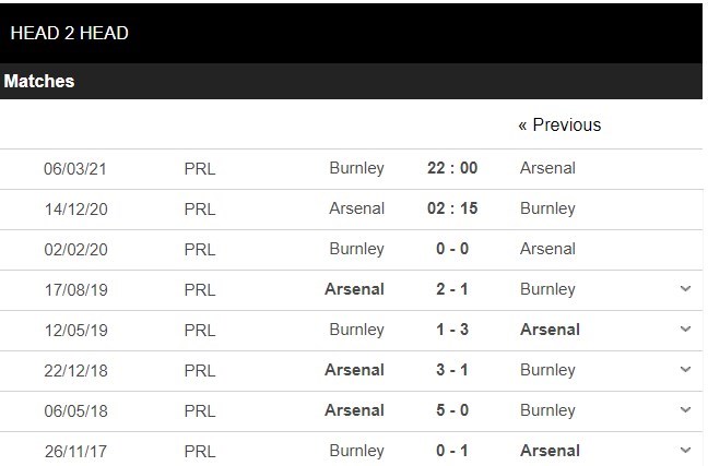 Thống kê đối đầu Arsenal vs Burnley