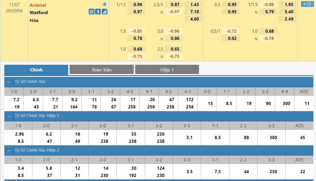 Tỷ lệ kèo cá cược bóng đá trực tuyến trận Arsenal vs Watford