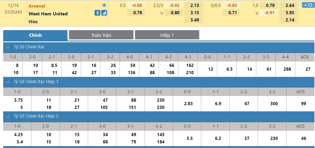Tỷ lệ kèo cá cược bóng đá trực tuyến trận Arsenal vs West Ham