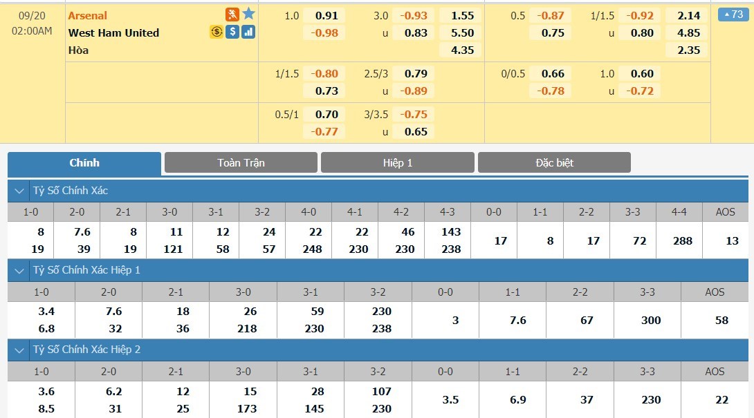 Xem tỷ lệ kèo cá cược bóng đá trực tuyến Arsenal vs West Ham United