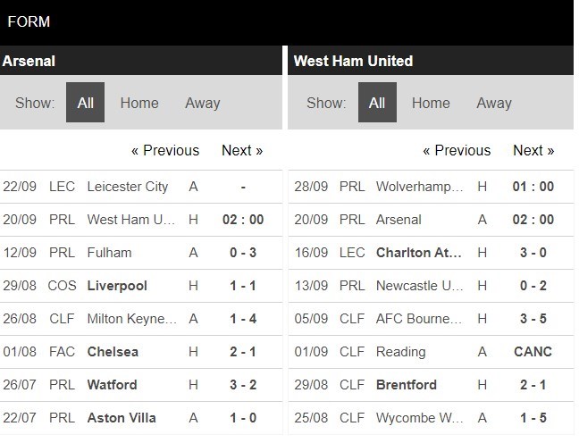 Thống kê phong độ Arsenal vs West Ham United