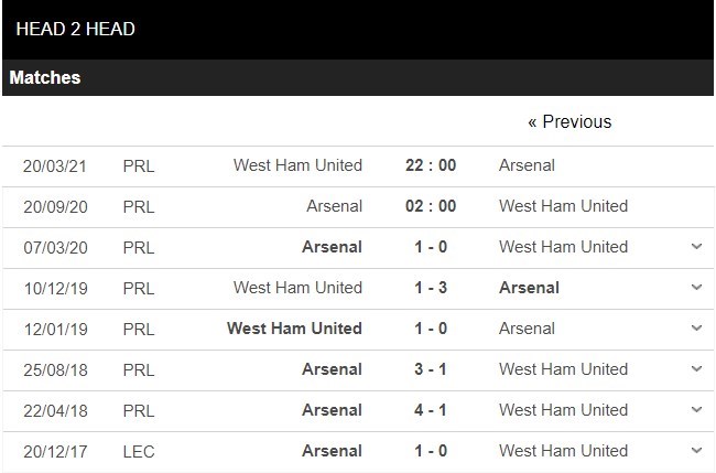 Thống kê đối đầu Arsenal vs West Ham United