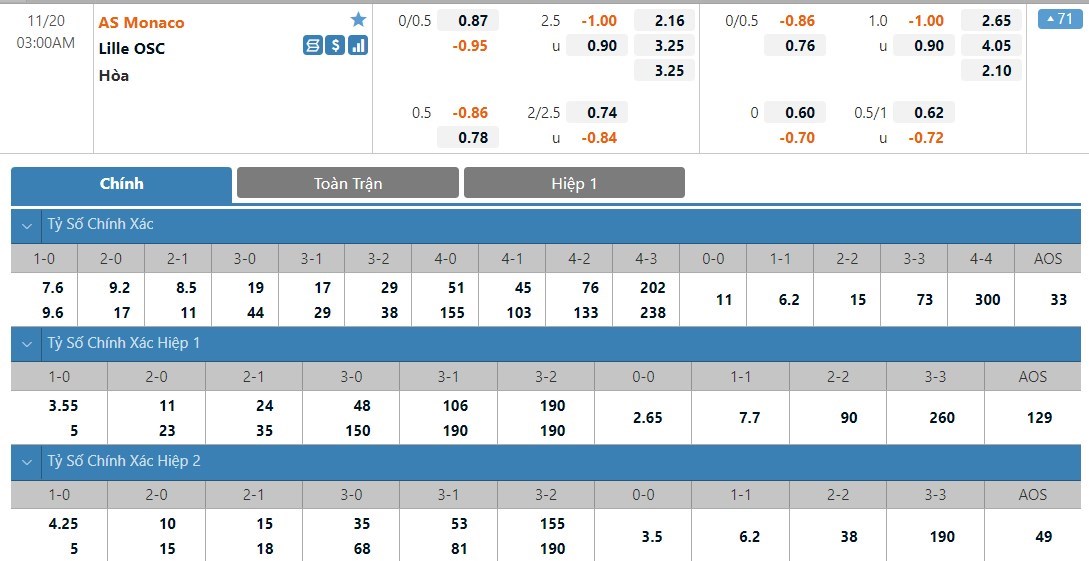 Tỷ lệ kèo cá cược bóng đá trực tuyến trận AS Monaco vs Lille OSC