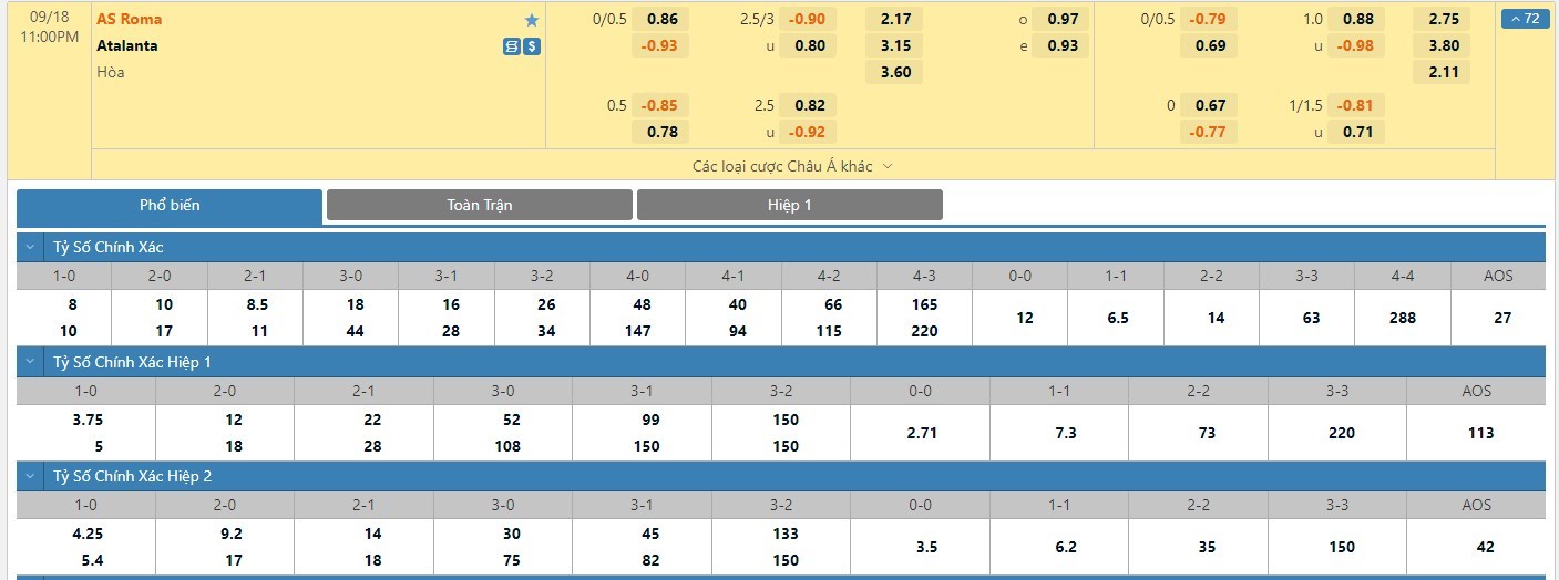 Tỷ lệ kèo cá cược bóng đá trực tuyến trận AS Roma vs Atalanta