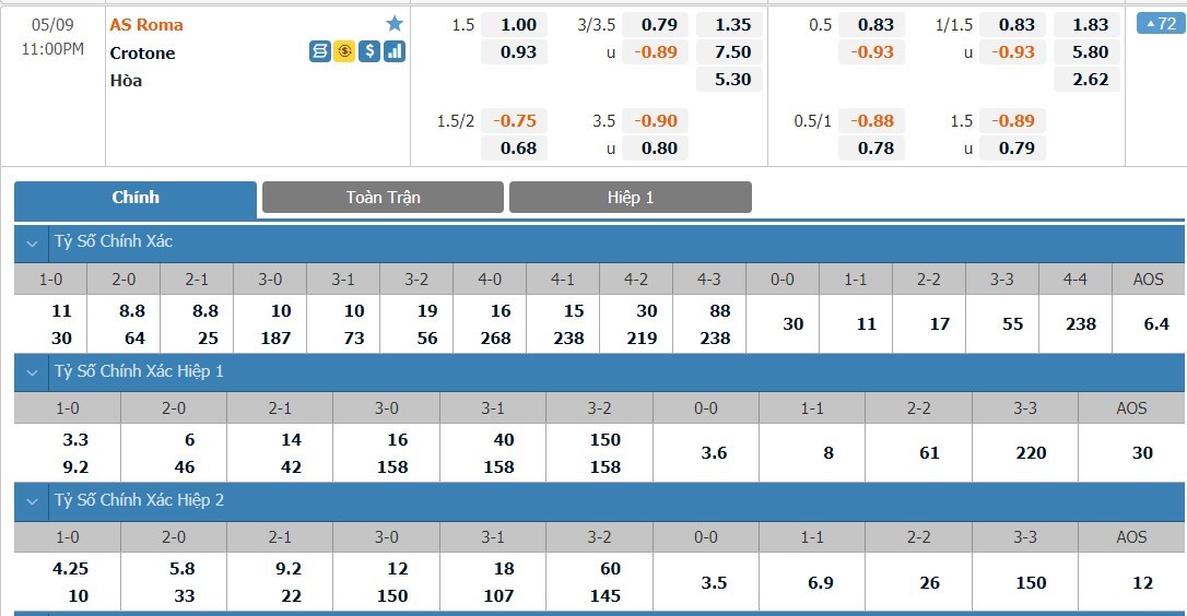 Tỷ lệ kèo cá cược bóng đá trực tuyến trận AS Roma vs Crotone