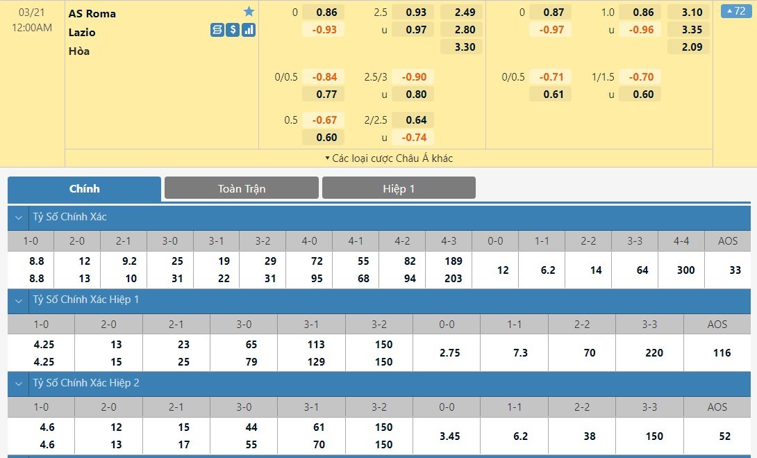 Xem tỷ lệ kèo cá cược bóng đá trực tuyến AS Roma vs Lazio