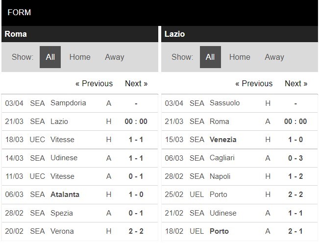 Thống kê phong độ AS Roma vs Lazio