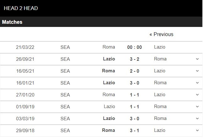 Thống kê đối đầu AS Roma vs Lazio