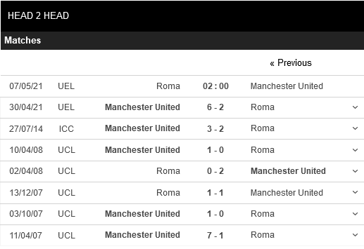 Thống kê đối đầu AS Roma vs Manchester United