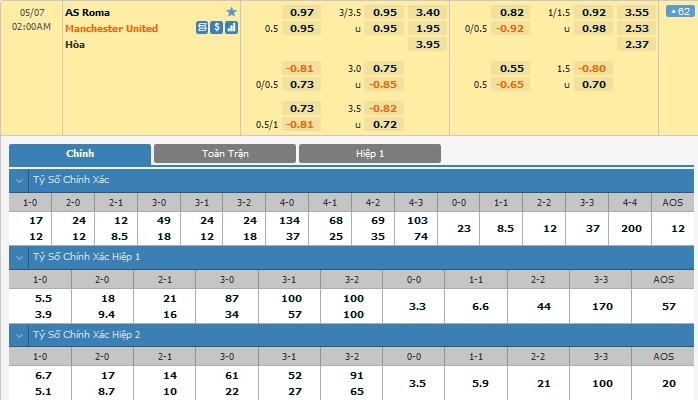 Xem tỉ lệ kèo cá cược bóng đá trực tuyến AS Roma vs Manchester United