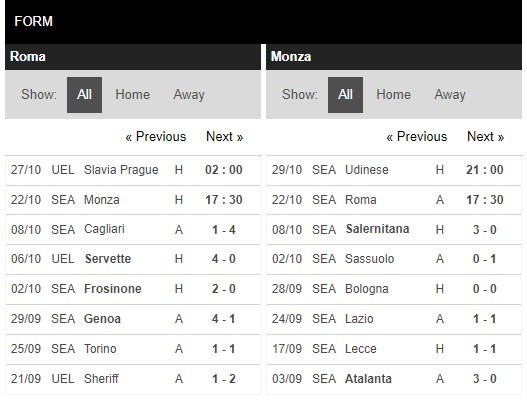 Thống kê đối đầu AS Roma vs Monza