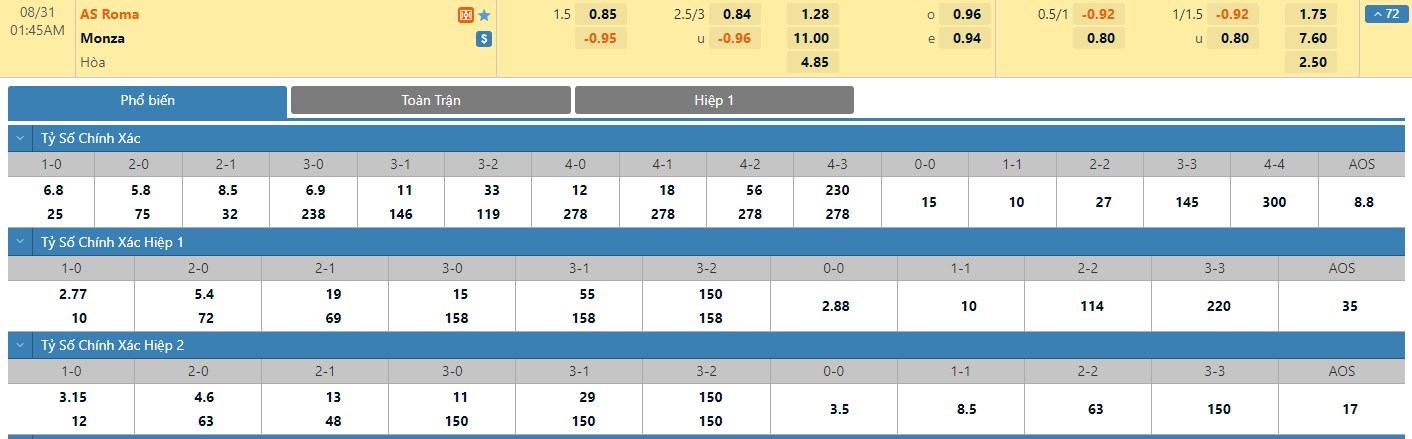 Tỷ lệ kèo cá cược bóng đá trận AS Roma vs Monza