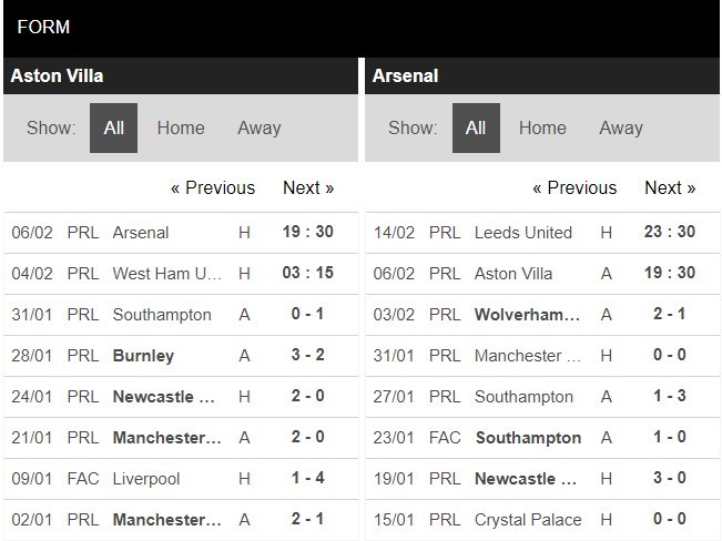 Thống kê phong độ Aston Villa vs Arsenal