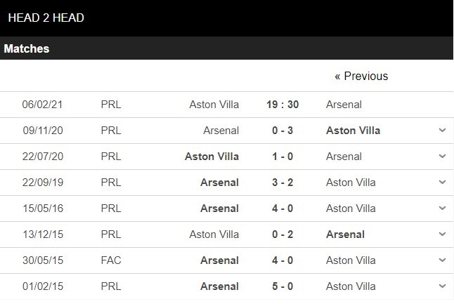 Thống kê đối đầu Aston Villa vs Arsenal