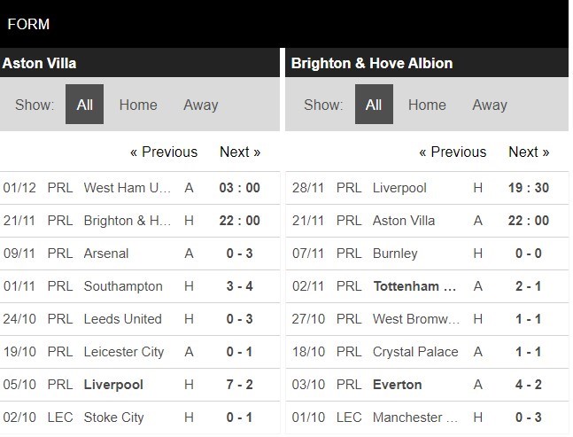 Thống kê phong độ Aston Villa vs Brighton