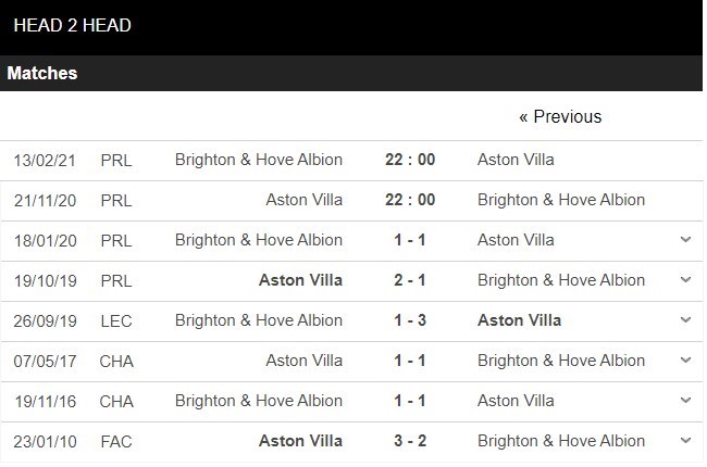 Thống kê đối đầu Aston Villa vs Brighton