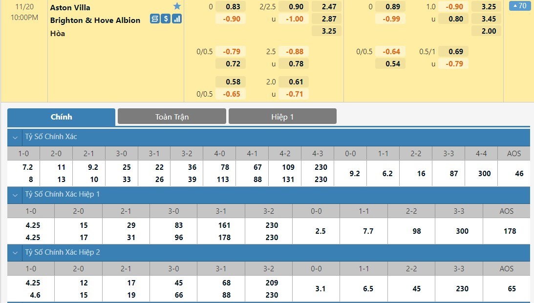 Tỷ lệ kèo cá cược bóng đá trận Aston Villa vs Brighton