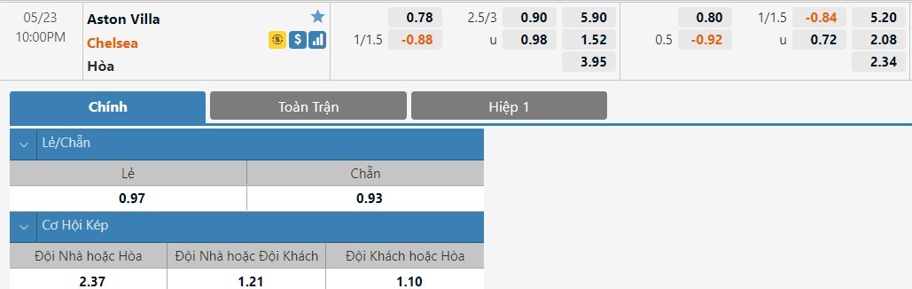 Tỷ lệ kèo cá cược bóng đá trực tuyến trận Aston Villa vs Chelsea