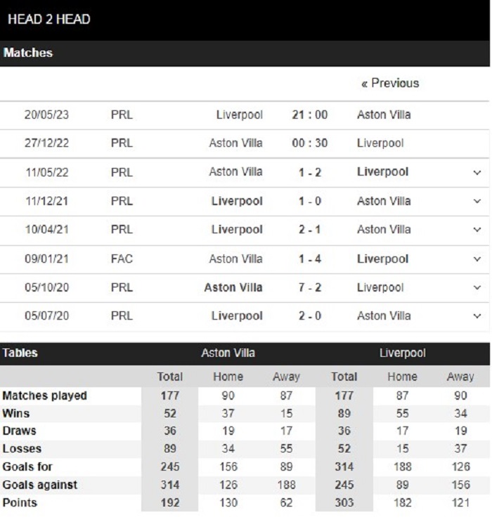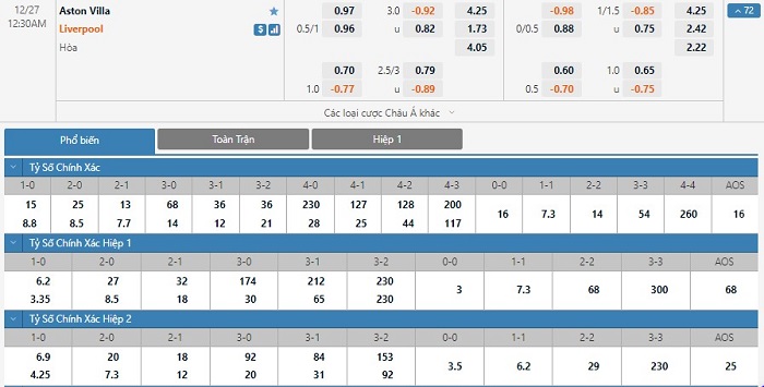 Xem tỷ lệ kèo cá cược bóng đá trực tuyến Aston Villa vs Liverpool
